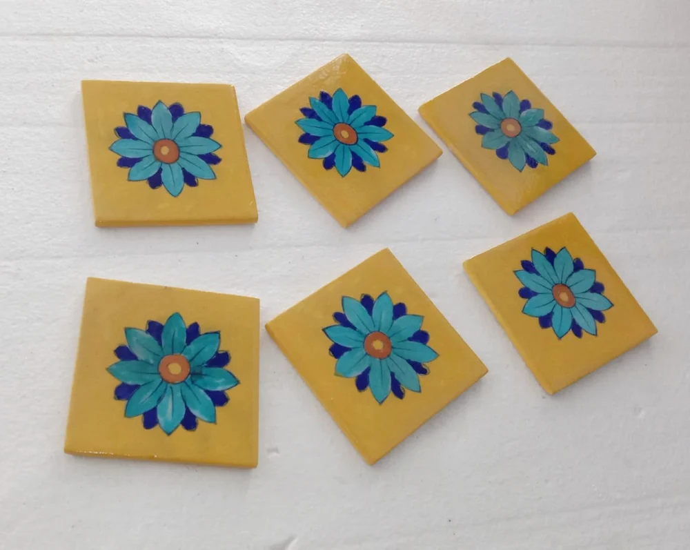 Add a touch of timeless elegance to your space with our handcrafted Blue Pottery Design Tiles. Featuring vibrant floral patterns in shades of blue and turquoise on a warm yellow base, these tiles are perfect for walls, table tops, coasters, or decorative accents. Made using traditional Jaipur blue pottery techniques, each tile is a piece of art that reflects rich Indian heritage.